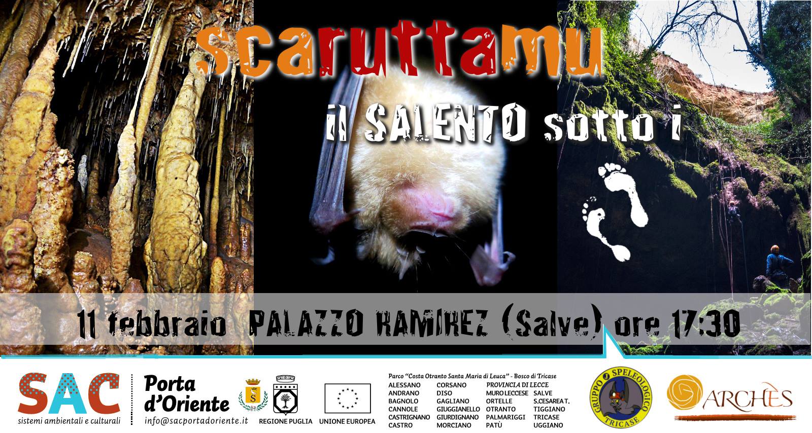 A SALVE, L'Associazione Archès e il Gruppo Speleologico Tricase (GST) propongono un pomeriggio dedicato al Salento sotterraneo. Si tratta di un viaggio fotografico attraverso il Salento che non ti aspetti, quello che si trova celato sotto le suole delle nostre scarpe, "scaruttatu" (scavato) dall'acqua, a volte anche dall'uomo, prima di raggiungere la sua conformazione attuale. Ore 17:30, presso Palazzo Ramirez, in Piazza Concordia.