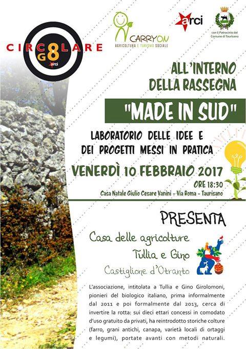 Alle 18:30, in un incontro pubblico presso la casa Vanini a TAURISANO, si darà il via alla rassegna Made in Sud, alla scopertà di piccole e grandi realtà locali che, in un periodo sociale difficile, hanno saputo mettersi in gioco, percorrendo strade antiche e a volte innovative.