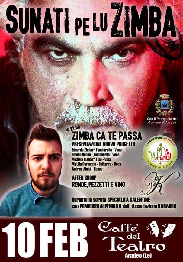 Alle 21:00 presso il Caffè del Teatro di ARADEO, serata musicale in memoria e onore di PINO ZIMBA, “Sunati pe lu ZIMBA” e a seguire ronde di pizzica, pezzetti e vino.